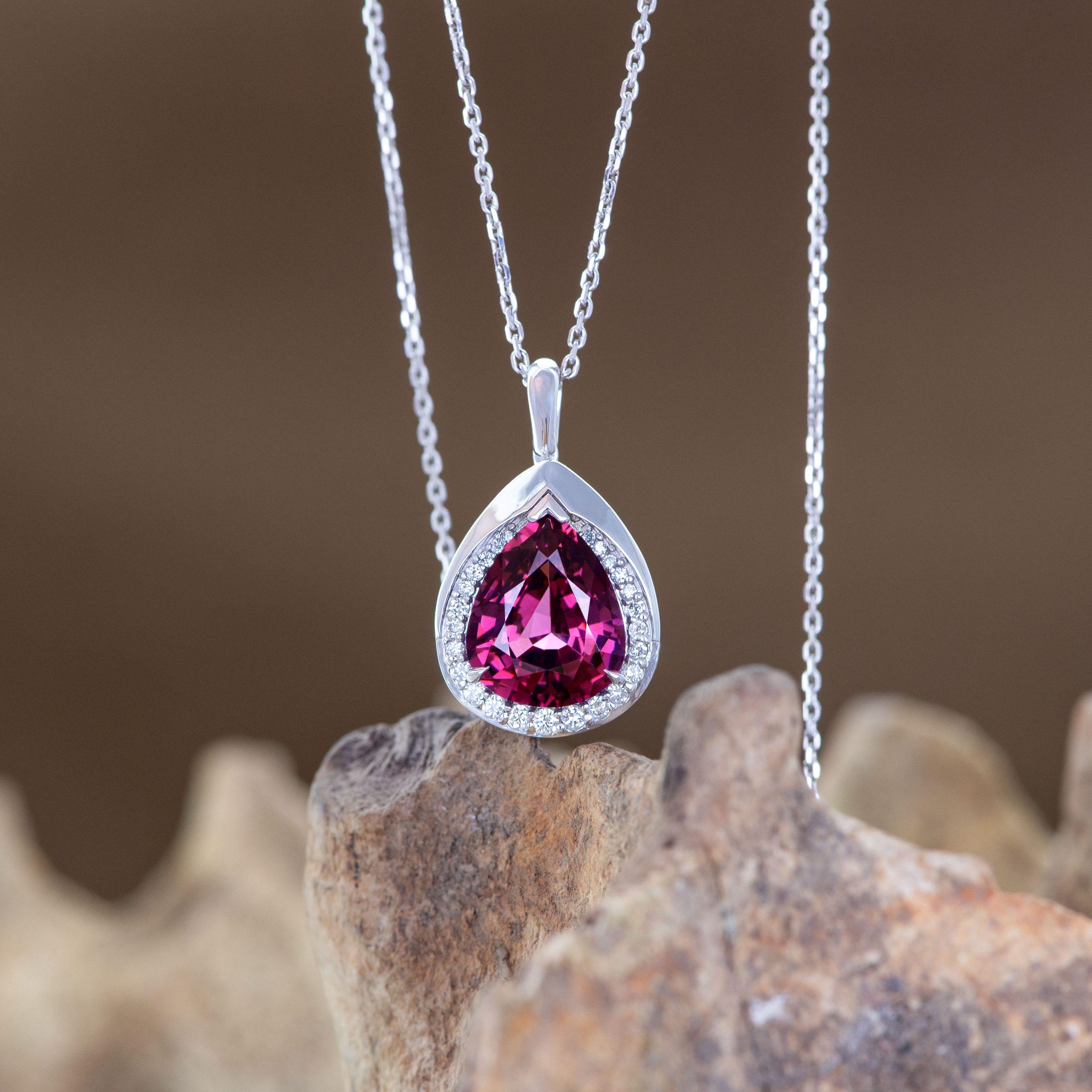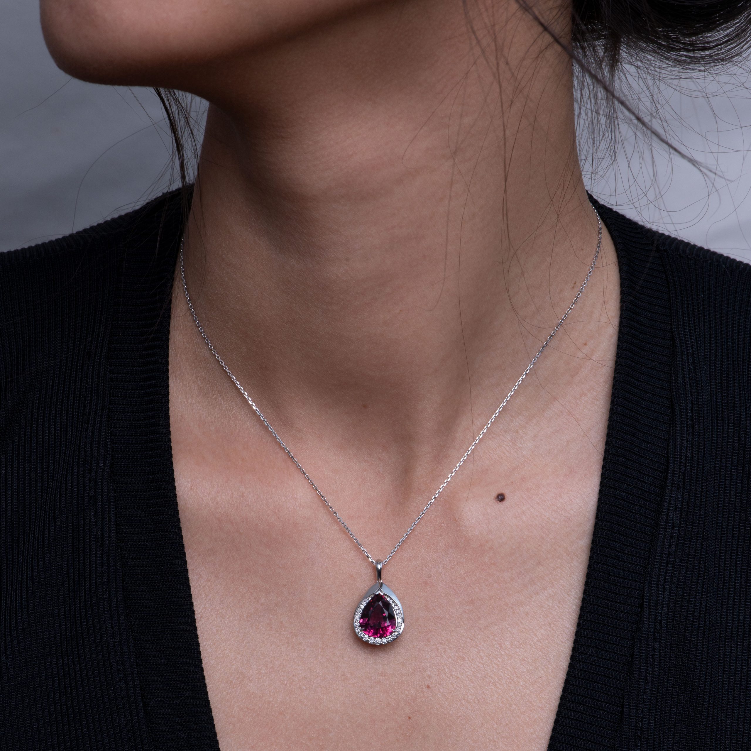Laissez-vous séduire par l’intensité de cette rhodolite de 4,49 carats, sublimée par 25 diamants, dans ce pendentif en or blanc 18K au caractère affirmé.