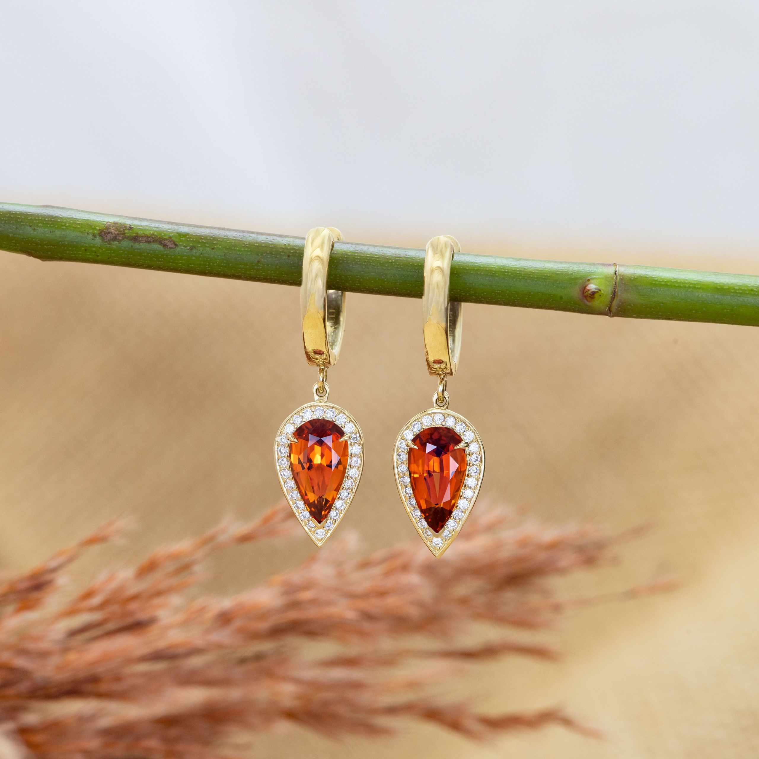 Paire de boucles d’oreilles en or jaune 18K (4,89g), avec 2 spessartites (2,52 carats) et 52 diamants (0,20 carat), une création audacieuse et éclatante.