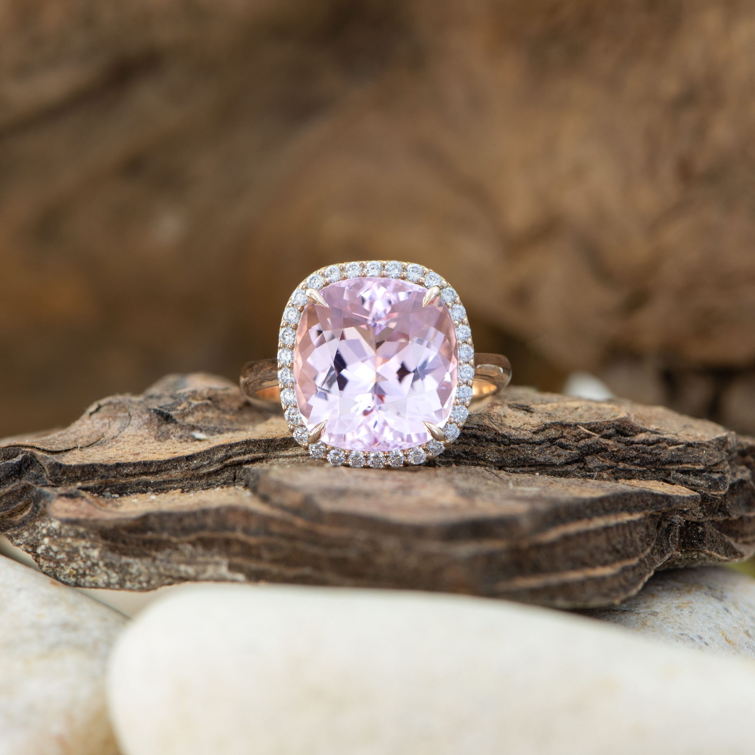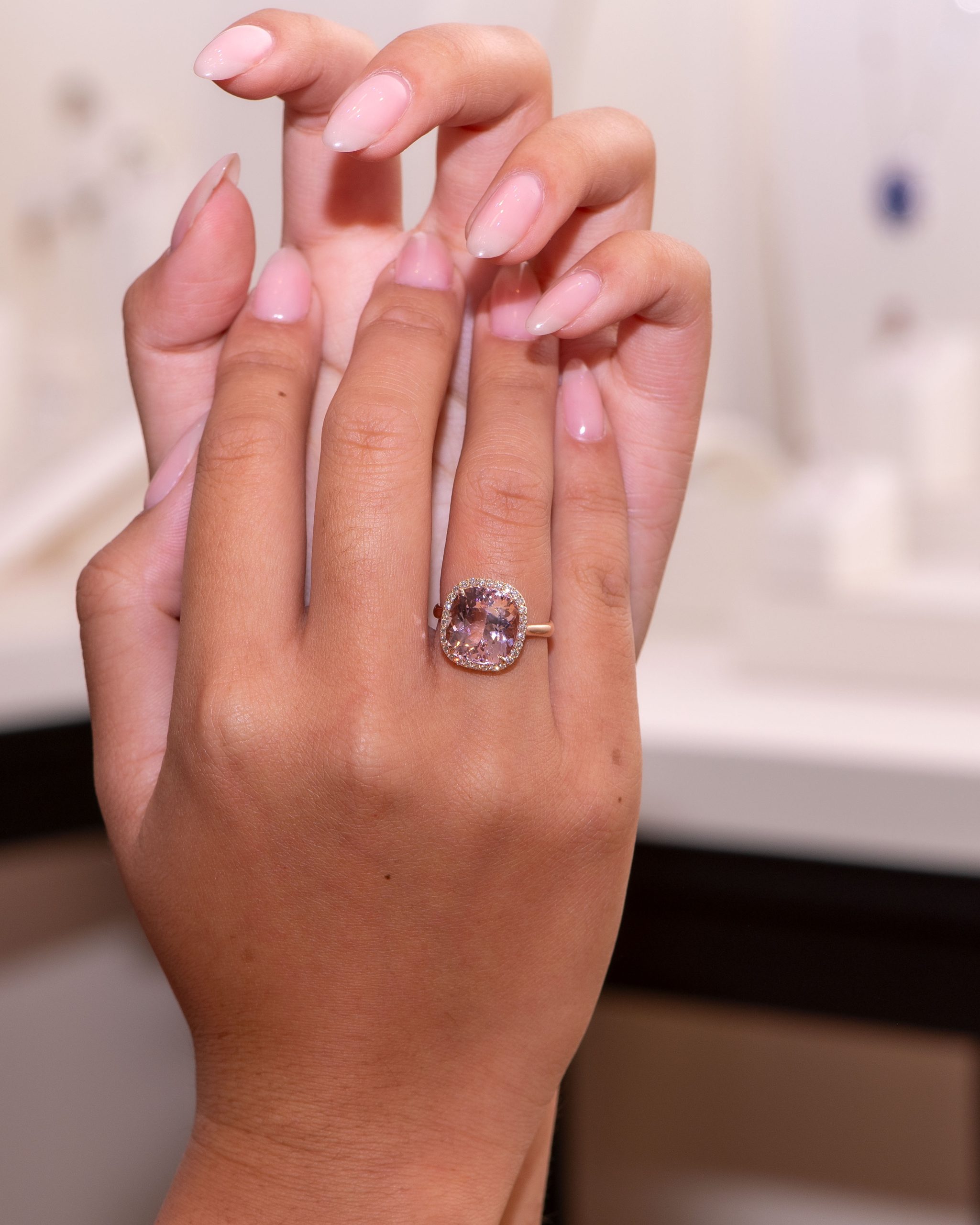 Cette bague en or rose 18K met en lumière une somptueuse morganite de 5,16 carats, sublimée par 30 diamants (0,26 carat)